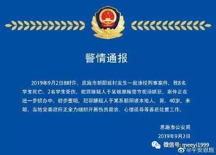 據湖北省恩施州公安局官方微博通報,9月2日8時許,恩施市朝陽坡村發生一起涉校刑事案件,致8名學生死亡、2名學生受傷。日前,教育部已于當日會同公安部派出督導組趕赴現場進行督導。