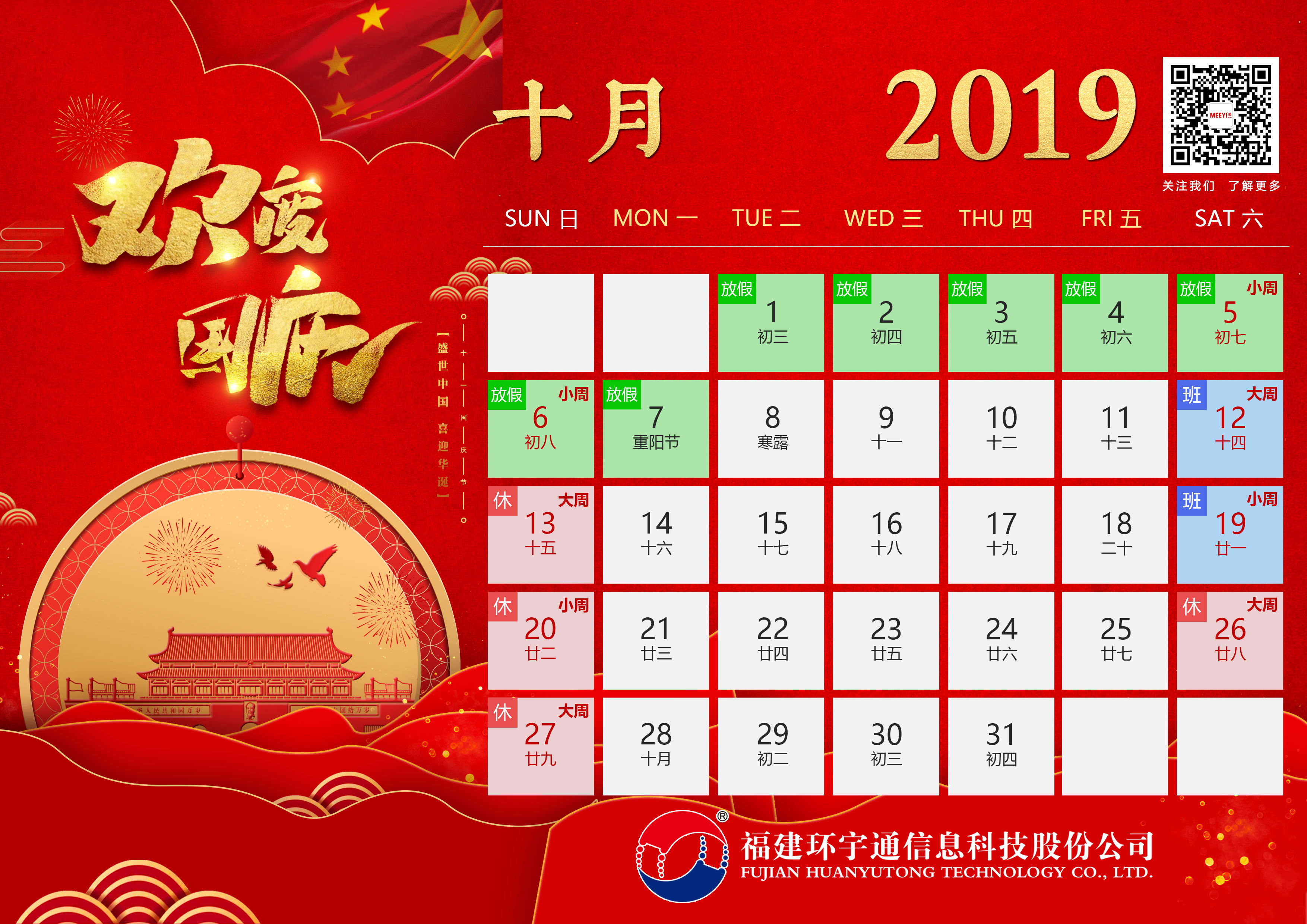 國慶佳節到來,祝愿祖國愈發繁榮富強,平安昌盛,同時也祝愿所有同胞們節日快樂。 為響應國家法定節假日的安排,我司決定于10.1-10.7安排休假,于10.8日正式上班,由于休假給您帶來的困擾報以萬分的歉意。