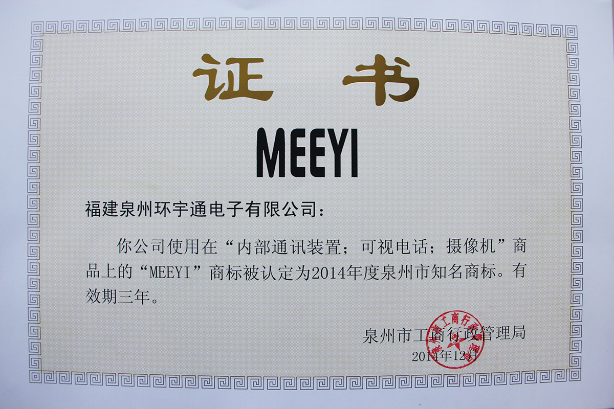 于近日,泉州市工商管理局根據(jù)《泉州市知名商標認定和保護辦法》規(guī)定向社會進行公告,認定福建泉州環(huán)宇通電子有限公司的“MEEYI”商標等165件為2014年度泉州市知名商標。