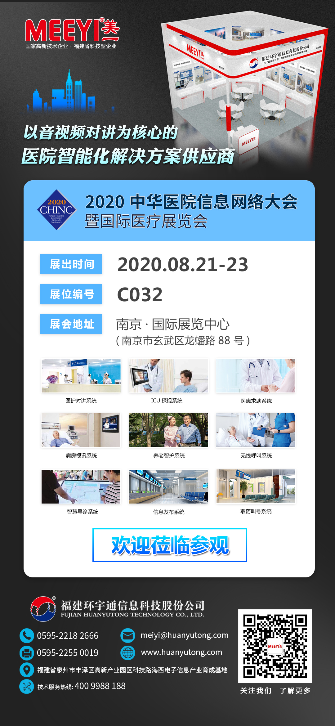 2020年8月21日,福建環宇通信息科技股份公司旗下品牌MEEYI美一將在南京國際展覽中心舉辦的中華醫院信息網絡大會暨中國醫療信息技術展覽上亮相。