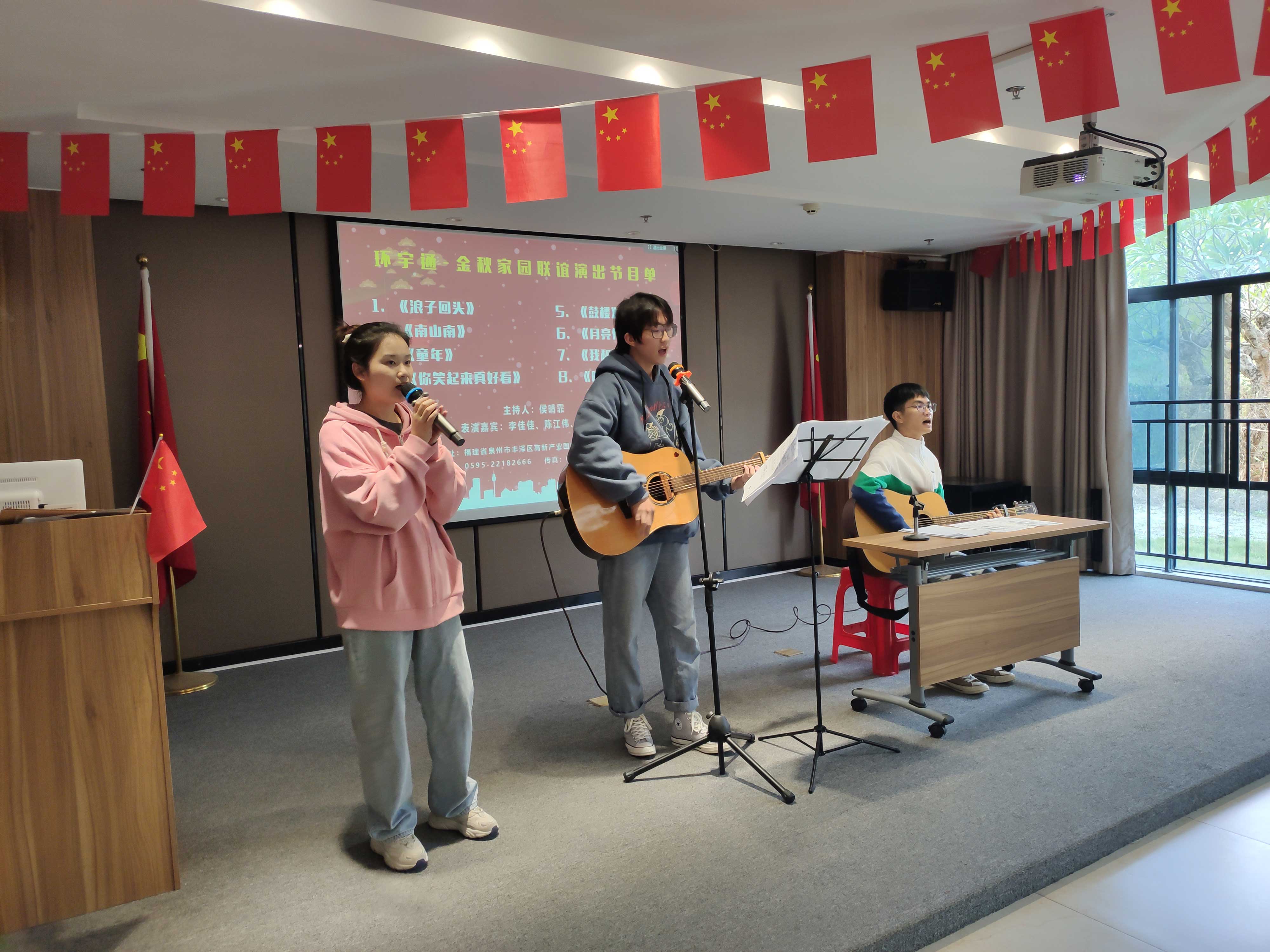 在一小時(shí)的傾情演出中,環(huán)宇通“半導(dǎo)體”樂隊(duì)吉他彈唱了8首歌曲。環(huán)宇通“半導(dǎo)體”樂隊(duì),組建不到一個(gè)月,平均年齡22歲,由環(huán)宇通公司的實(shí)習(xí)生和新員工組合而成,充滿青春氣息。精彩編排的節(jié)目讓現(xiàn)場(chǎng)氣氛高漲,掌聲、叫好聲不斷,受到了長(zhǎng)者們的喜愛。