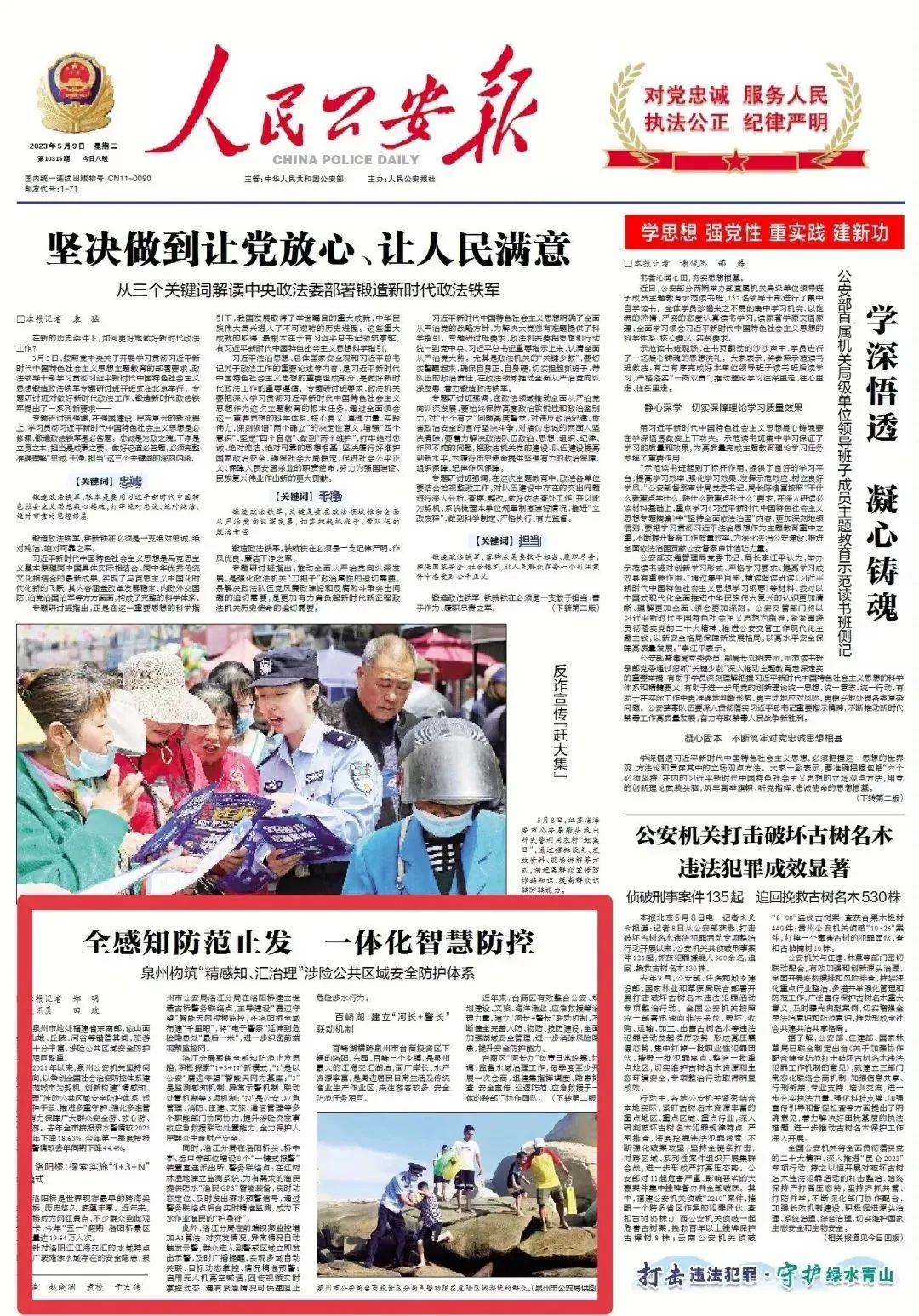 5月9日,《人民公安報(bào)》頭版以《全感知防范止發(fā) 一體化智慧防控》為題,大幅報(bào)道了泉州市公安局創(chuàng)新構(gòu)建“精感知、匯治理”涉險公共區(qū)域安全防護(hù)體系,保障群眾安全游、放心游、快樂游的舉措和成效。