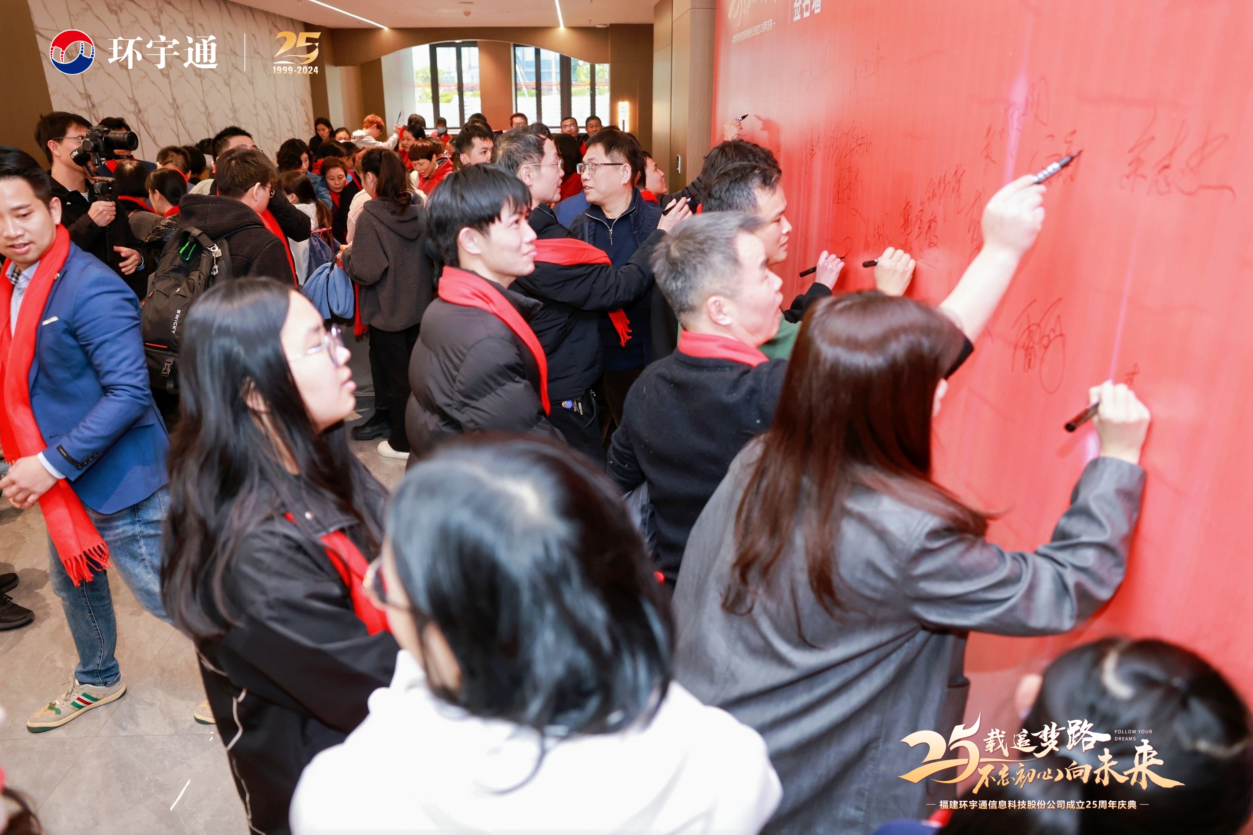 隨著時間的推進,慶典活動正式開始,會場內便是一片歡樂的海洋。在公司的精心籌備下,舞臺大屏上展示的是公司25年來的回顧,場內布置著公司發展歷程墻與顯目的簽名墻。大家滿懷激動之情拿起馬克筆,認真地簽上自己的名字,留下自己對公司的祝福和對未來的期許。這不僅是對個人參與慶典的紀念,更是對公司25年發展歷程的見證,每一份簽名都承載著員工對公司的熱愛與忠誠,對未來的憧憬與希望。