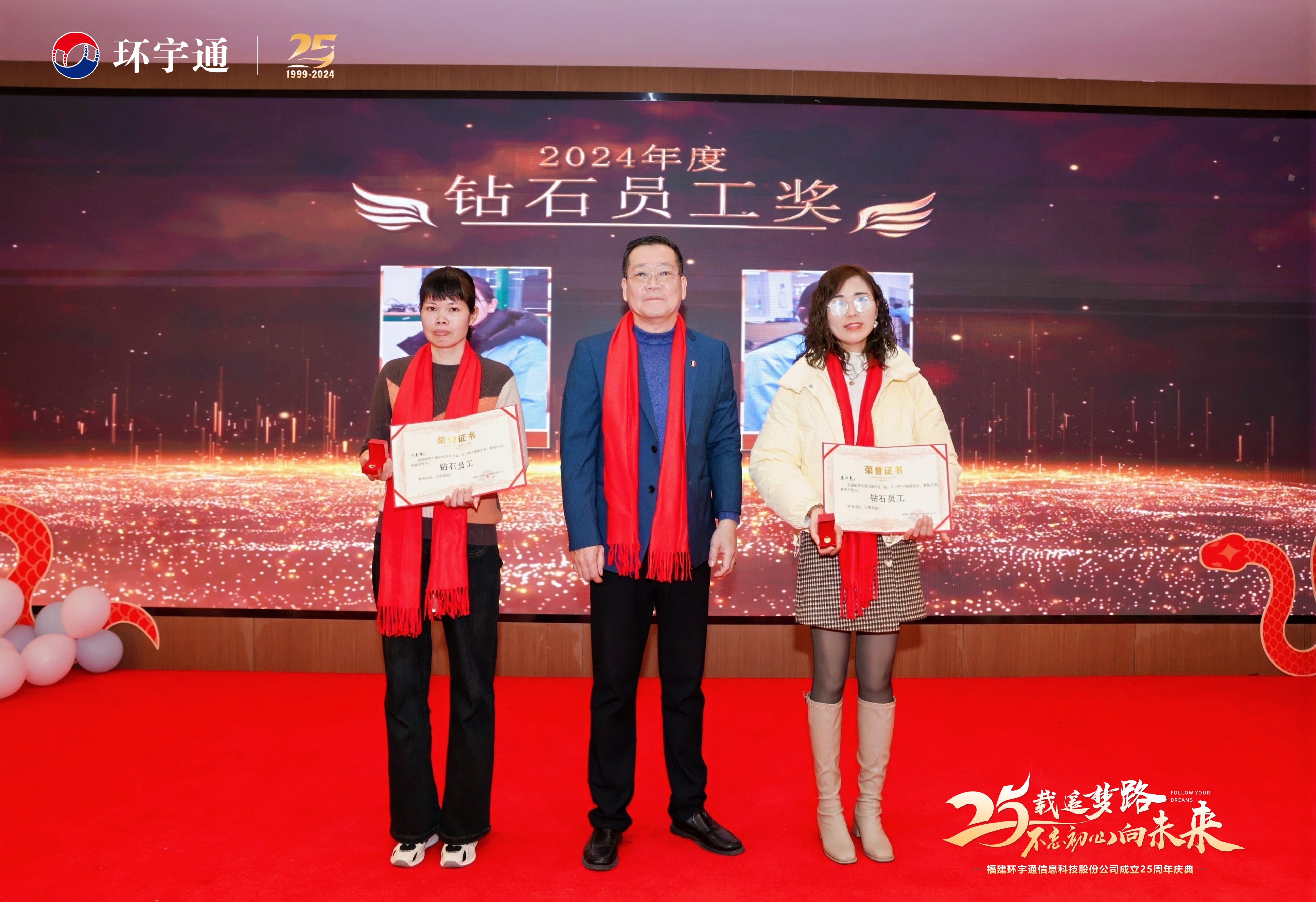 隨后,公司舉行了隆重的表彰儀式,對當年度入職滿10年的員工授予鉆石員工榮譽、入職滿5年的員工授予金牌員工榮譽。這些榮譽是對公司員工長期堅守崗位、默默付出肯定。截至目前,環宇通公司現有鉆石員工48人,金牌員工90人。每一位獲獎者的名字背后,都是一段段辛勤耕耘的故事,每一枚金質徽章都閃耀著他們智慧與汗水的光芒。他們的堅守與奉獻,為環宇通的發展注入了強大的動力,推動著公司不斷前行,向著更高的目標邁進。